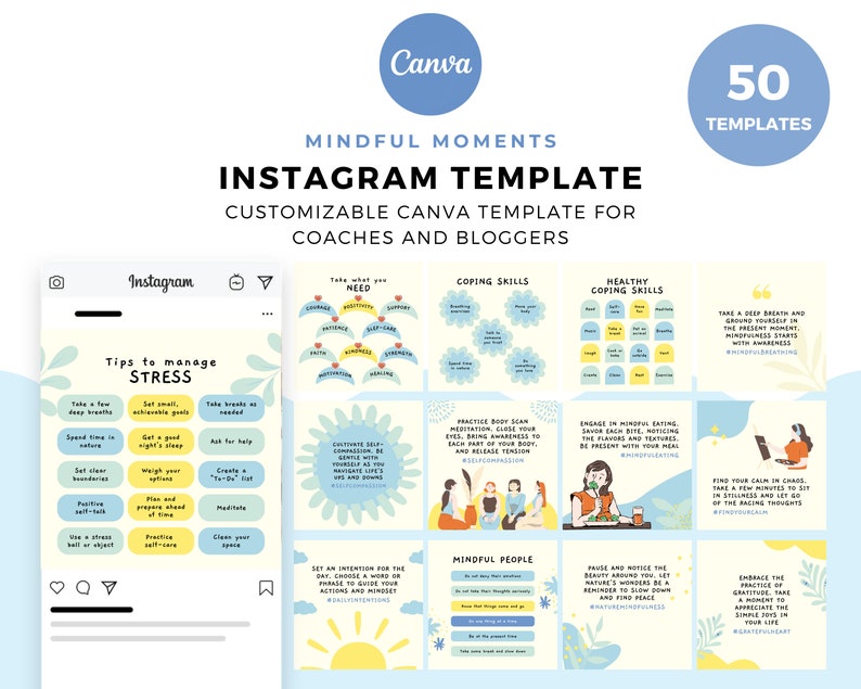 This bundle focuses on promoting mindfulness and stress reduction through Instagram templates. It can include templates for guided breathing exercises, visualization techniques, stress management tips, and mindful activities. The templates could incorporate elements like nature-inspired backgrounds, calming animations, and minimalist design to evoke a sense of tranquility and encourage engagement.