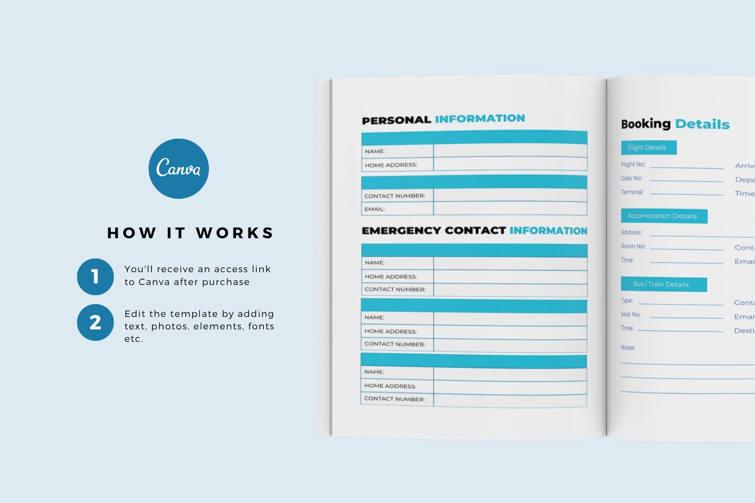 Travel Planner, Editable Travel Canva Planner