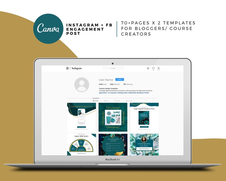 Features 70 engagement posts, swoon-worthy template designs to help you grow your audience, nurture and entertain your followers, and market your digital offers.
