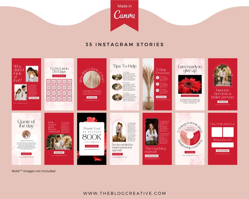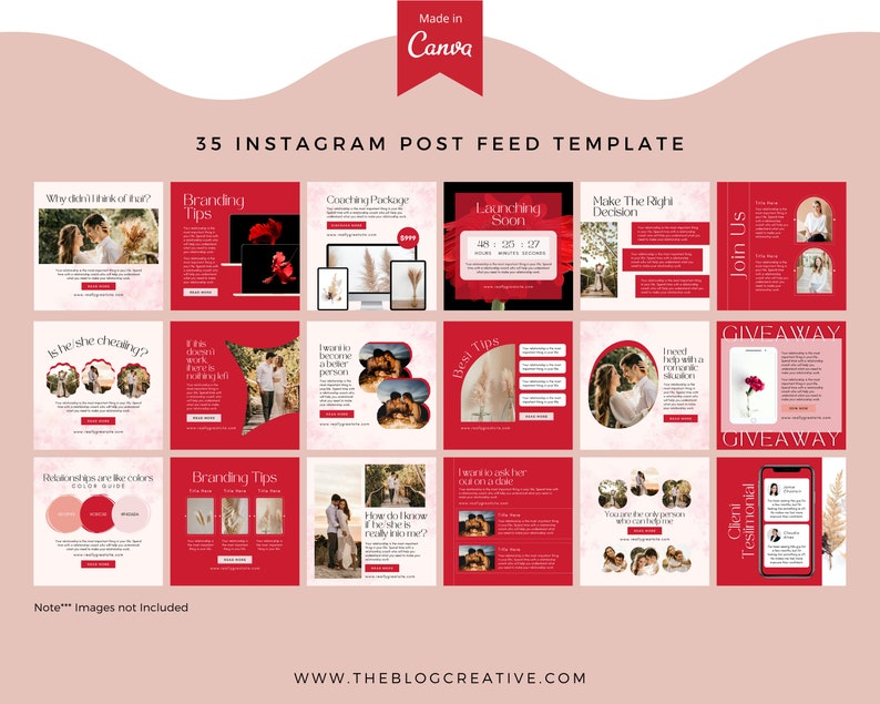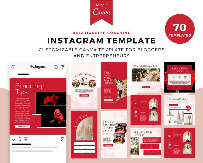 Unlock the power of love with our curated relationship coaching Instagram Canva templates. Whether you're a romance and love coach, a love coach, or a relationship expert, our templates will help you to spread your brand message with ease. Our social media bundle includes captivating Instagram posts and stories with a signature red colour palette. Get started now and build the perfect platform to connect and inspire your followers.