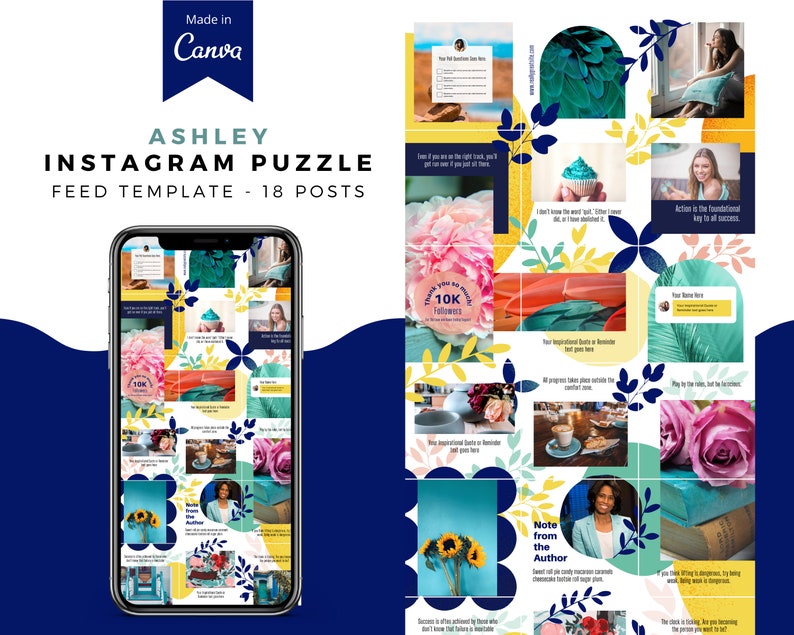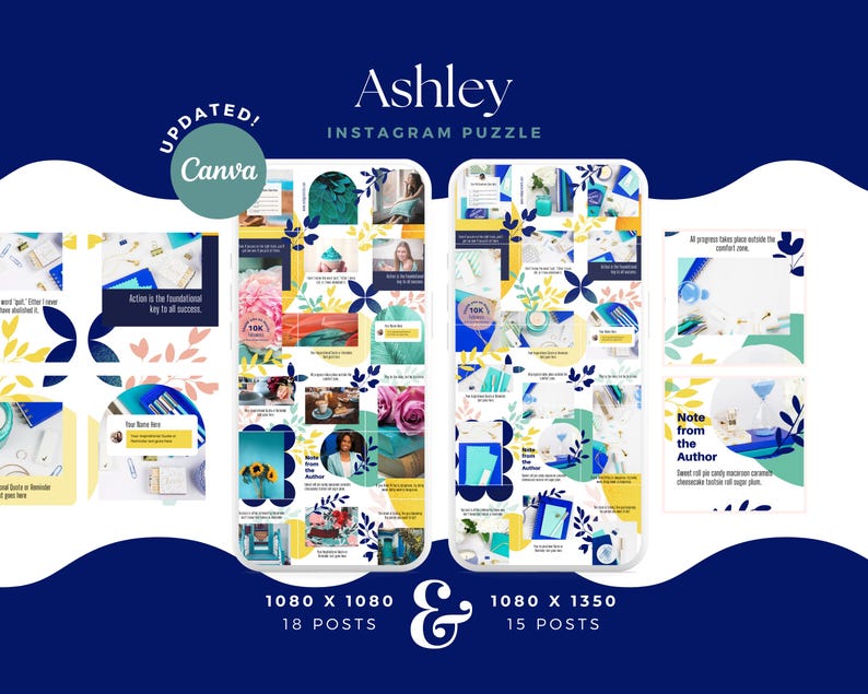 This Canva Puzzle Feed is your secret to a scroll-stopping Instagram Layout that connects your audience to your brand with every swipe. Available in 2 sizes (1080x1080 and 1080x1350), the Ashley set includes 18 square posts and 15 vertical posts, seamlessly crafted to help you maintain a professional and beautiful Ig Puzzle Feed.