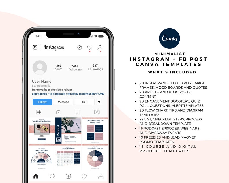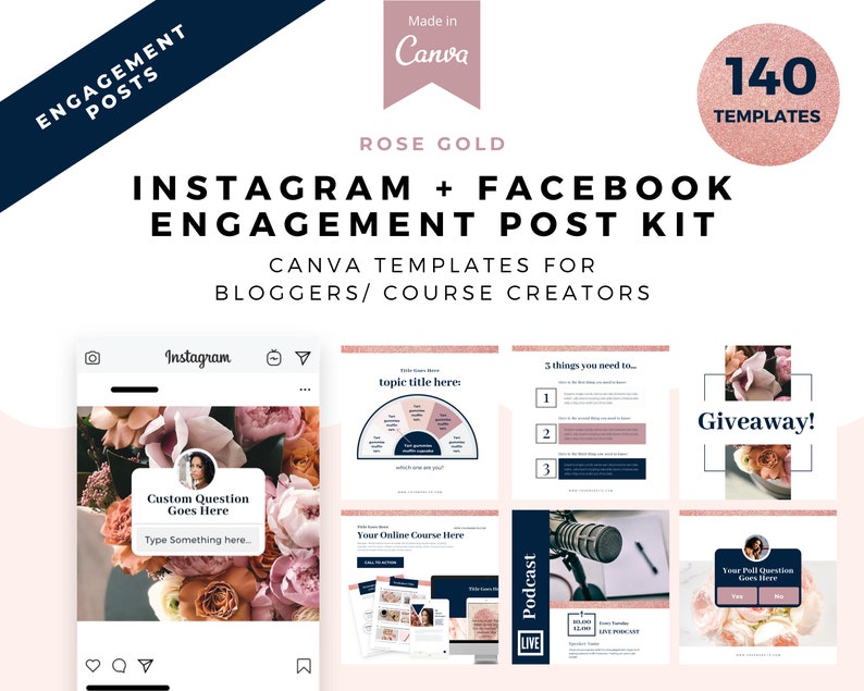 Featuring 70 Instagram + 70 Facebook engagement posts, swoon-worthy template designs to help you grow your audience, nurture and entertain your followers, and market your digital offers.