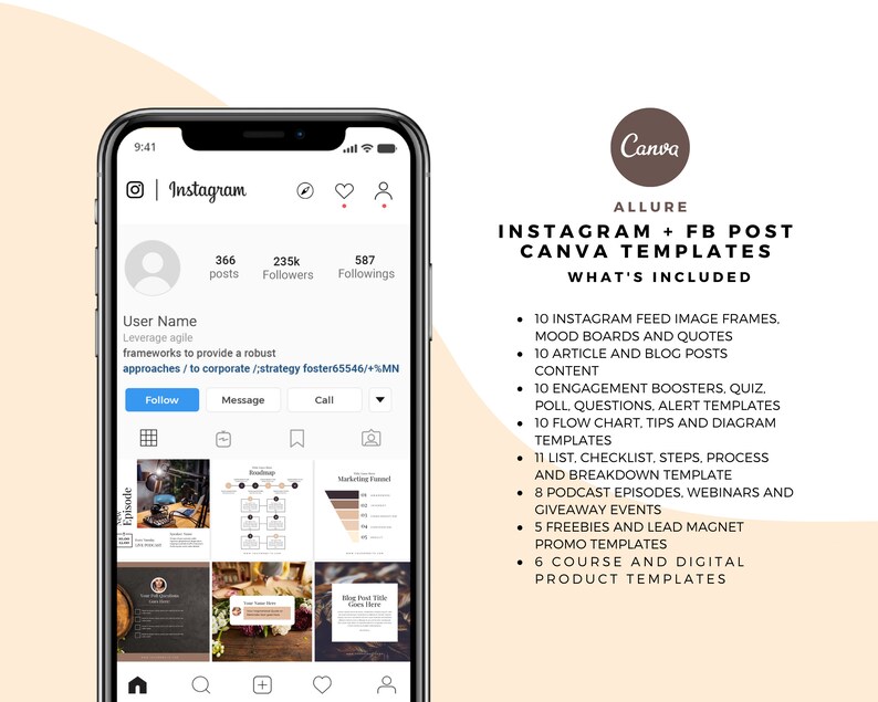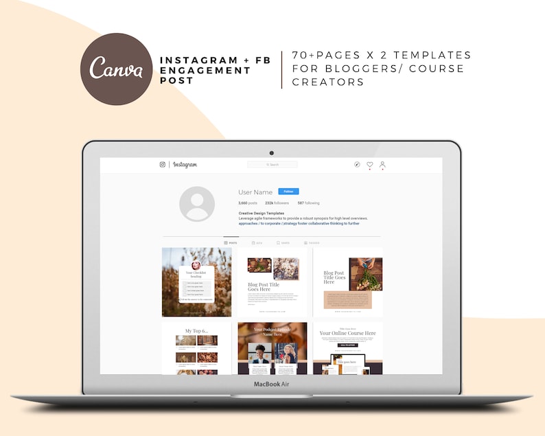 Featuring 70 engagement posts, swoon-worthy template designs to help you grow your audience, nurture and entertain your followers, and market your digital offers.